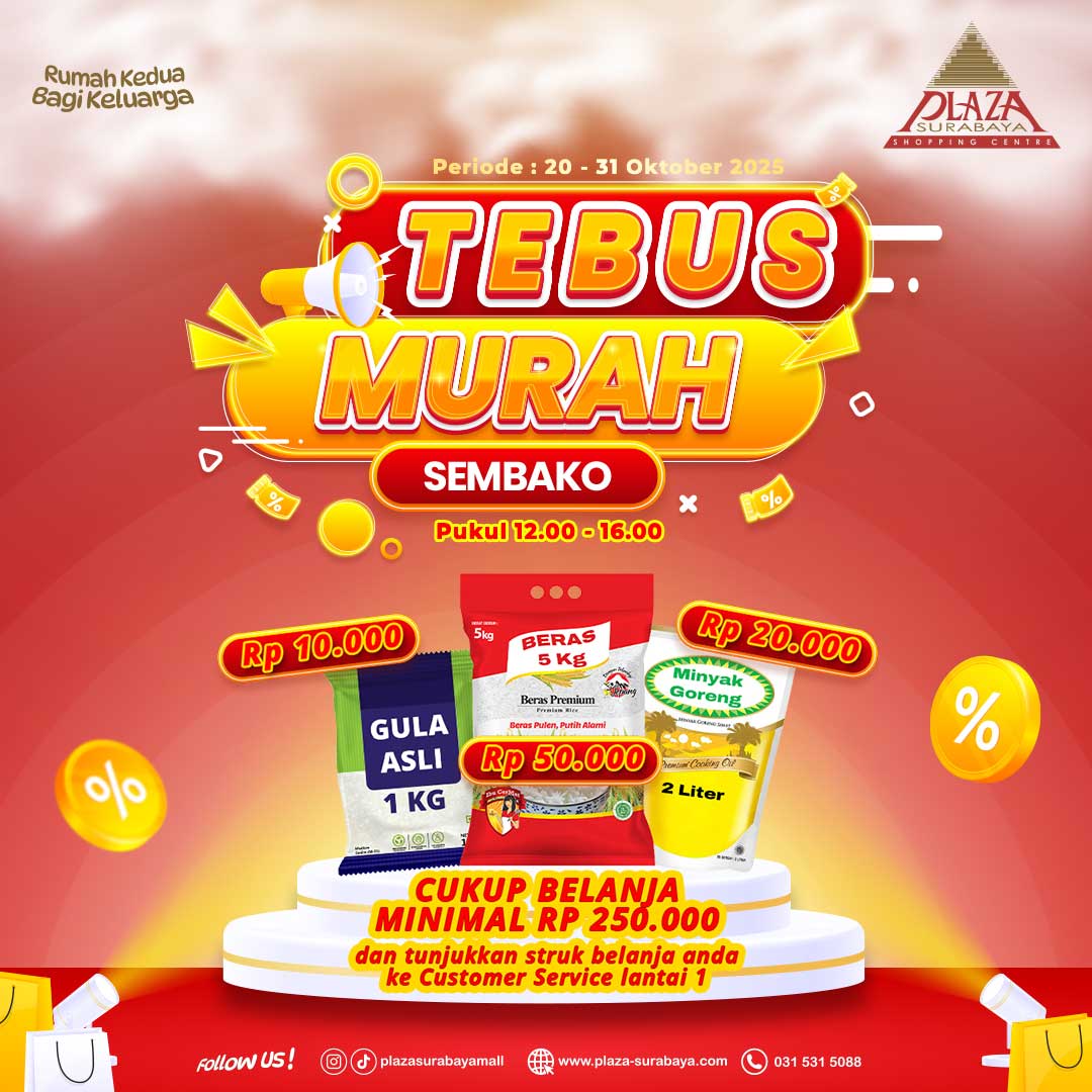 Belanja di Plaza Surabaya langsung bisa TEBUS MURAH SEMBAKO! ~ 1 kg Gula premium hanya Rp 10.000 ~ 2 lt Minyak Goreng premium hanya Rp 20.000 ~ 5 kg Beras premium hanya Rp 50.000 Tunjukkan struk belanjamu minimal Rp 250.000 ke Customer Service lantai 1. Tunggu apa lagi???? Yukk cusss... Stok terbatas... segera kunjungi dan berbelanja di Plaza Surabaya !!! #PlazaSurabaya #RumahKeduaBagiKeluarga #TebusMurah #PromoSurabaya #SembakoMurah #DiskonBesar #BelanjaCerdas #SurabayaHits #EventSurabaya #JanganSampaiKetinggalan ...