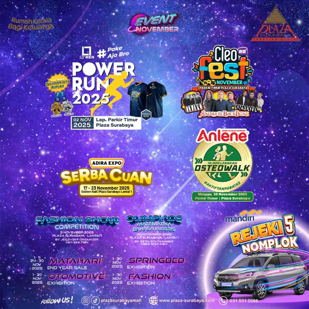 November Penuh Kejutan di Plaza Surabaya! 🎉 Mulai dari Power Run, Cleo Fest, Anlene Osteowalk, Fashion Competition dan Olimpiade Matematika dan Bahasa Inggris. Matahari, Otomotif, Springbed, dan Fashion Exhibition juga hadir di Plaza Surabaya. Ada juga kesempatan bawa pulang hadiah utama mobil di program Rejeki Nomplok 5! Jadi tunggu apalagi... Cusss ajak keluarga dan teman buat belanja di Plaza Surabaya! #EventNovemberSurabaya #EventSurabaya #RejekiNomplok #RumahKeduaBagiKeluarga #PlazaSurabaya ...